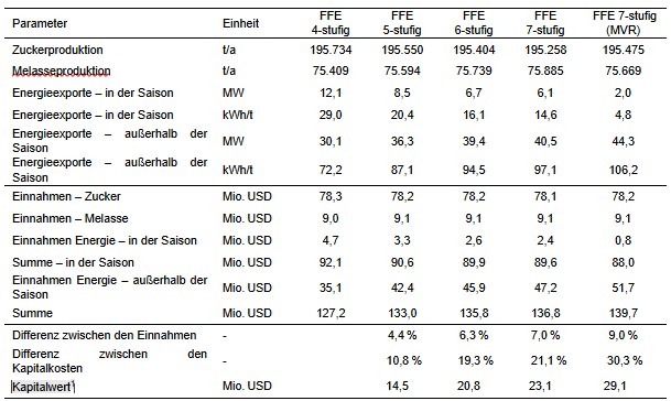 Da zusätzliche Verdampferstufen mit höheren Kapitalkosten verbunden sind, ist es wichtig, deren Einfluss auf die Wirtschaftlichkeit des Gesamtprojekts zu bewerten. Die Tabelle zeigt die jährliche Zucker-, Melasse- und Energieproduktion für verschiedene Konfigurationen einer Fabrik mit einer Verarbeitungskapazität von 10.000 Tonnen Zuckerrohr pro Tag und einer Betriebszeit von 180 Tagen.